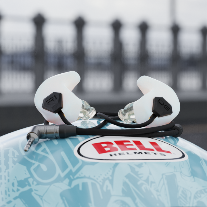 The custom earphone is shaped to be flush for comfort underneath a helmet. It is made of a 25 Shore soft silicone ear canal tip going into the inner ear and a 40 Shore outer shell to give ultimate comfort whilst being worn underneath a helmet.