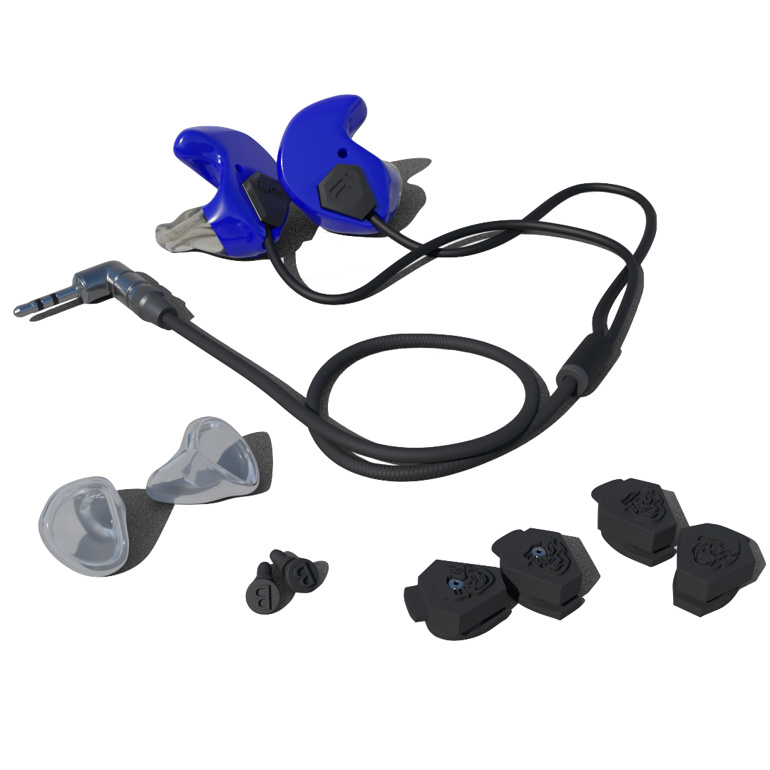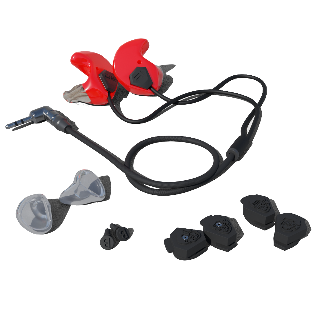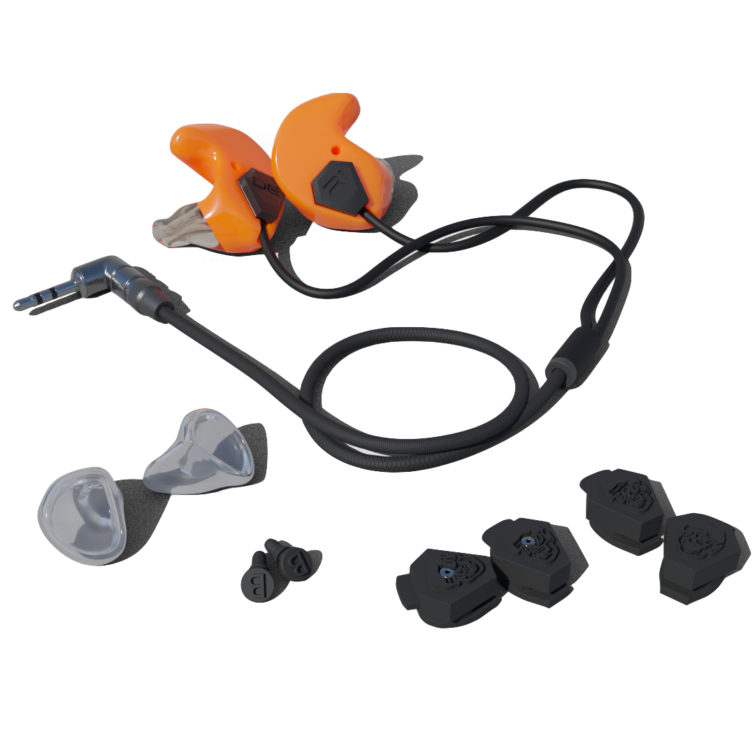 The custom earphone is shaped to be flush for comfort underneath a helmet. It is made of a 25 Shore soft silicone ear canal tip going into the inner ear and a 40 Shore outer shell to give ultimate comfort whilst being worn underneath a helmet.